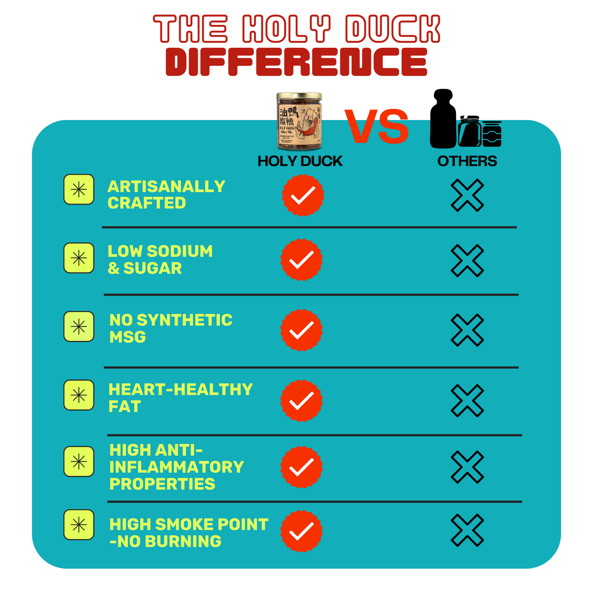 Waddle you know? Holy Duck Chil Oil is not just tasty, it's a health conscious pick! Discover the benefits of Holy Duck Chili Oil, a flavorful option that also prioritizes your well-being.