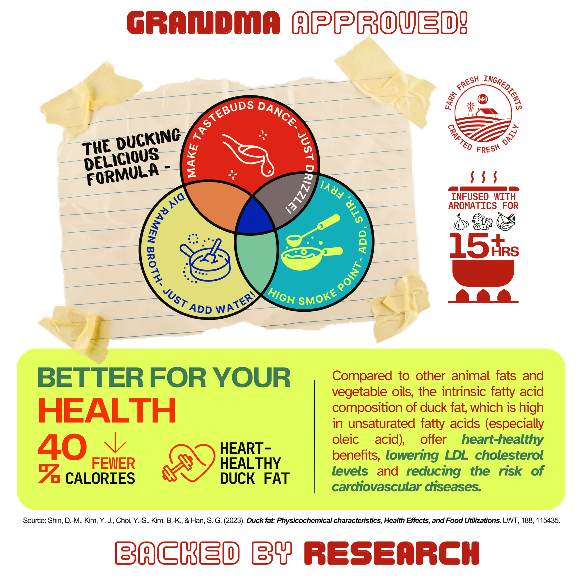 - Duck fat elevates Holy Duck Chili Oil to heavenly levels, infusing it with unmatched flavor and health benefits.